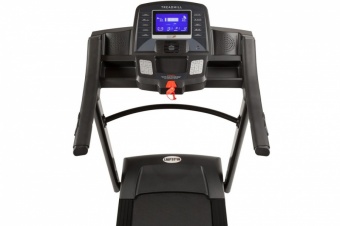 Благодаря мощному и бесшумному двигателю 2,5 л/с Вы можете регулировать скорость движения беговой дорожки от 0,8 до 18 км/ч. На панели управления и рукоятках расположены клавиши быстрого изменения скорости и угла наклона бегового полотна. Кроме этого, на рукоятках также расположены датчики измерения пульса, что позволяет осуществлять кардио-контроль в процессе тренировки. Данные о частоте сердечных сокращений, а также другие ключевые показатели (дистанцию, время, скорость, угол подъема, расход калорий) компьютер выводит на 7-дюймовый LCD монитор с подсветкой. Также с помощью компьютера пользователь может выбрать одну из 50 предустановленных программ тренировок. Сюда входят автоматические программы, пользовательские программы, программа ручной настройки, фитнес-тест, а также целевые программы, в т.ч. программы кардио-контроля.