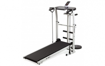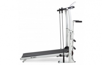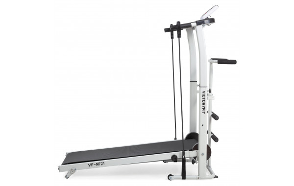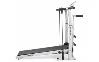 Беговая дорожка VictoryFit VF-NF21. Компактная модель механической дорожки без двигателя. Регулируемая высота поручней от 92-110 см от пола. В комплекте идут 2 эспандера (длина 90 см) и диск здоровья (диаметр 25 см). Сзади дорожки расположены поручни для занятий на диске. Спереди расположены валики для фиксации ног для упражнений на пресс. Компьютер отображает пройденную дистанцию, время, скорость, калории.