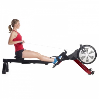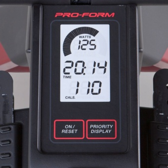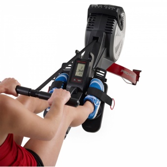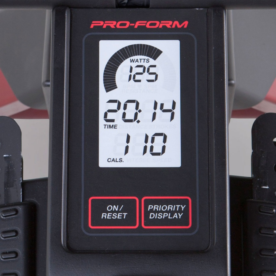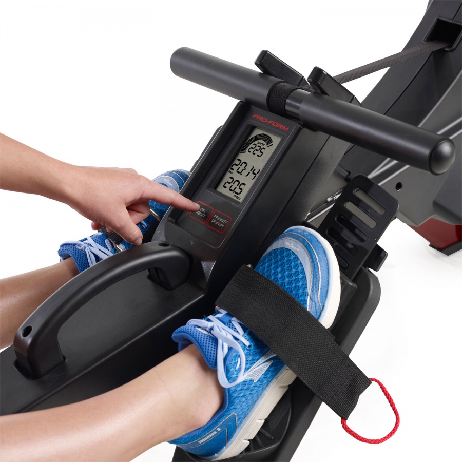• Гребля – это эффективная форма физических упражнений, развивающая силу мышц всего вашего тела и одновременно тренирующая вашу сердечно-сосудистую систему. Гребной тренажер Pro-Form R600 позволяет по новому подойти к старой школе тренировок. С ним Вы легко достигнете желаемого результата! Регулируемая аэродинамическая нагрузка. Удобная ручка на корпусе позволяет открывать и закрывать отверстия для регулировки потока воздуха. Чем сильнее вы гребете, тем больший объем воздуха проходит через лопасти вентилятора, и тем больше интенсивность тренировки и количество сожженых калорий. Эргономичное контурное сидение и мягкие рукоятки для идеальной посадки. Дизайн Space Saver®  позволит быстро сложить тренажер после занятия и освободить пространство в помещении с помощью встроенных транспортировочных колес. Для большей устойчивости педали с удобными ремешками регулируются по длине ступни. Оценить прогресс вы сможете с помощью большого ЖК-дисплея, на котором отображаются следующие параметры тренировки: скорость, время, расстояние, количество гребкой в минуту, количество сожженых калорий, выходная мощность в ваттах.