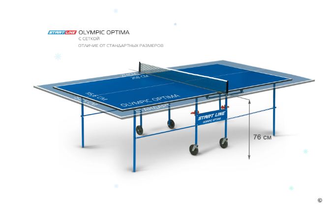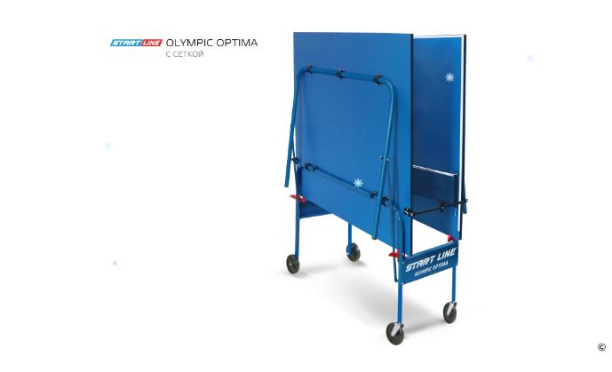 Olympic Optima привлекателен своим компактным размером, поэтому станет незаменим для установки в небольшом помещении. Его длина и ширина меньше стандартной, неизменной остается только высота в 76 см. Конструкцией предусмотрена возможность одиночной игры. Удобная компактная система сложения, легко складывается и раскладывается. Модель маневренная, оборудована встроенной сеткой, не требующей демонтажа при складывании. Olympic Optima предназначен для игры не только взрослых, но и детей. Габариты модели требуют минимального места при игре и обеспечивают удобное хранение стола между играми.