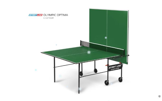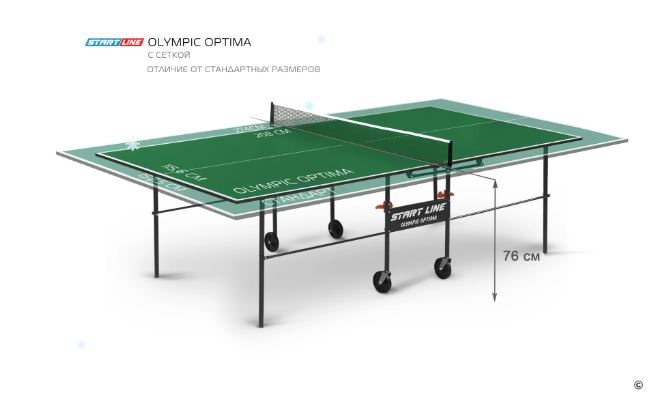 Olympic Optima привлекателен своим компактным размером, поэтому станет незаменим для установки в небольшом помещении. Его длина и ширина меньше стандартной, неизменной остается только высота в 76 см. Конструкцией предусмотрена возможность одиночной игры. Удобная компактная система сложения, легко складывается и раскладывается. Модель маневренная, оборудована встроенной сеткой, не требующей демонтажа при складывании. Olympic Optima предназначен для игры не только взрослых, но и детей. Габариты модели требуют минимального места при игре и обеспечивают удобное хранение стола между играми.