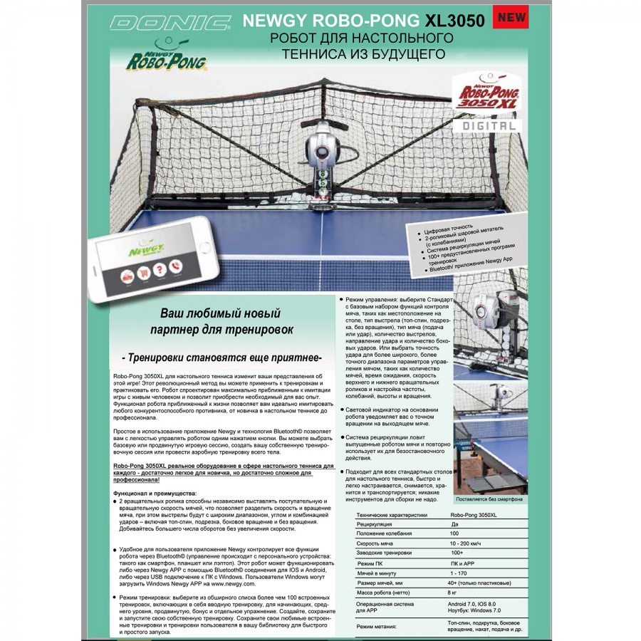 • Робот настольный DONIC NEWGY ROBO-PONG 3050 XL - это ваш новый любимый партнер для тренировок.
