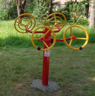 Применение: пользователь встает рядом с тренажером, берется руками за специальные ручки на рулях. Из исходного положения совершает вращательные движения руками по кругу.
