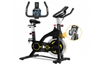 Спин-байк RAVS чёрного цвета имеет прочную стальную раму, что повышает его устойчивость и обеспечивает быструю езду. Он также оснащен большим алюминиевым маховиком с инерционным весом 19 кг, который обеспечивает дополнительный импульс и реалистичные ощущения от езды с препятствиями. Максимальный вес пользователя до 150 кг.