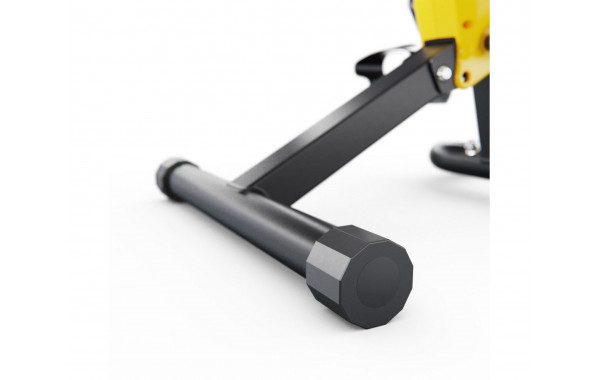 Конструкция велотренажёра складная. Длина эспандеров 70 см, а профиль рамы толщиной 1,2 мм. Педали с регулируемыми ремешками на липучках. На ножках расположены резиновые накладки для защиты от скольжения и царапания поверхности пола, а также компенсаторы неровности пола.